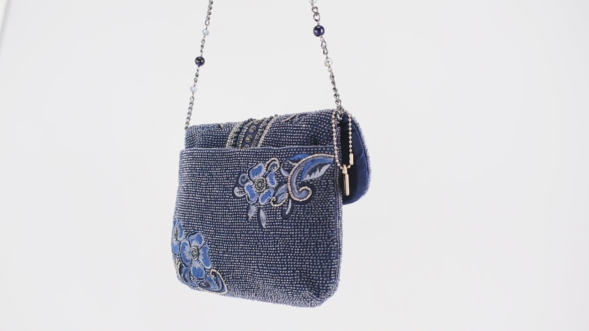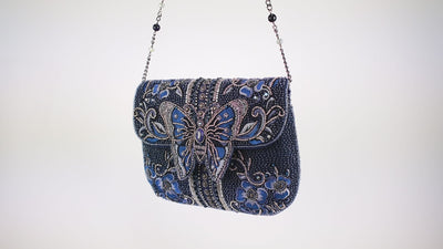 Graceful and eye catching, this deep blue beaded purse showcases a sparkling butterfly surrounded by blooming florals and delicate scrollwork. A true statement bag that brings elegance and beauty to any occasion.