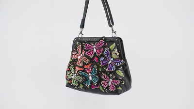 Kissed by color with this enchanting beaded bag. Designed on a sleek black base, it features vibrant butterflies in jeweled hues, fluttering among hand beaded flowers and leaves. Shimmering beadwork and sequins make each butterfly sparkle with movement, while the adjustable strap adds versatility.