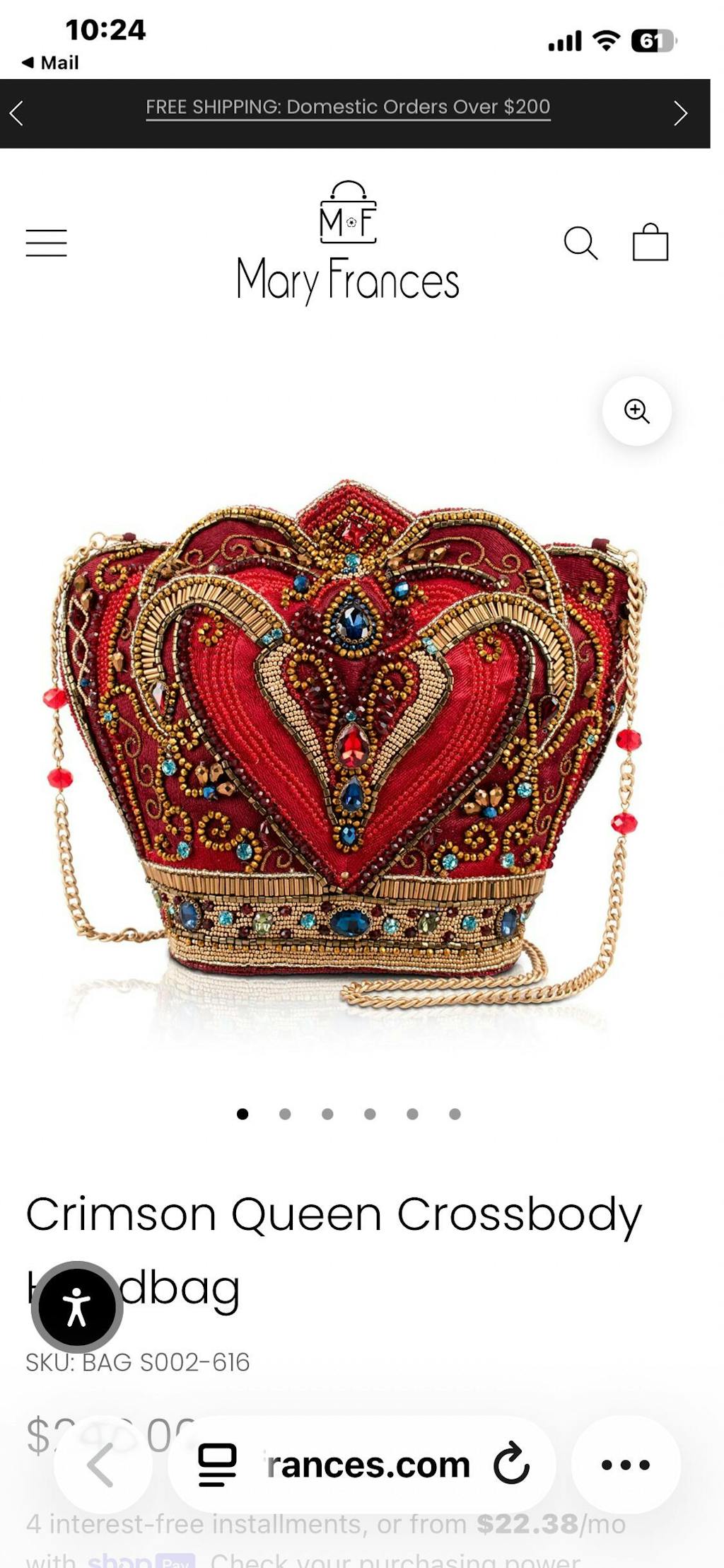 Rule every room with Crimson Queen a regal crown shaped bag in deep crimson, adorned with sparkling jewels, gold accents, and a heart shaped centerpiece. Finished with a chain strap, it’s a statement piece worthy of royalty. Pair it with the matching coin purse Your Majesty