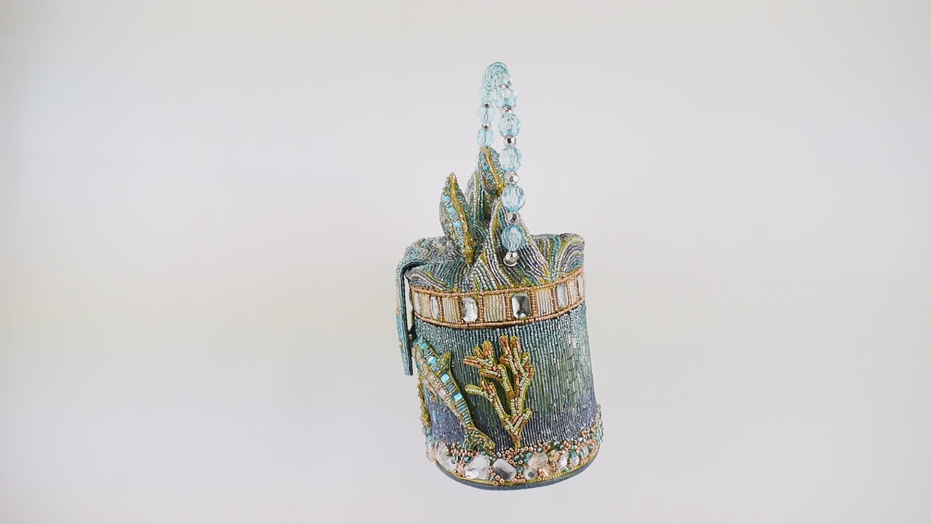 Make waves with this ocean inspired handbag. Featuring hand beaded dolphins leaping over waves with coral, fish, and starfish details below. A crystal beaded handle adds extra sparkle, making it a true statement piece.