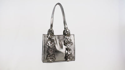 A metallic pewter finish gives this leather top handle bag its modern edge, while cascading floral details along the straps add a touch of feminine charm. Spacious yet polished, it’s a versatile style that works beautifully from day to night.