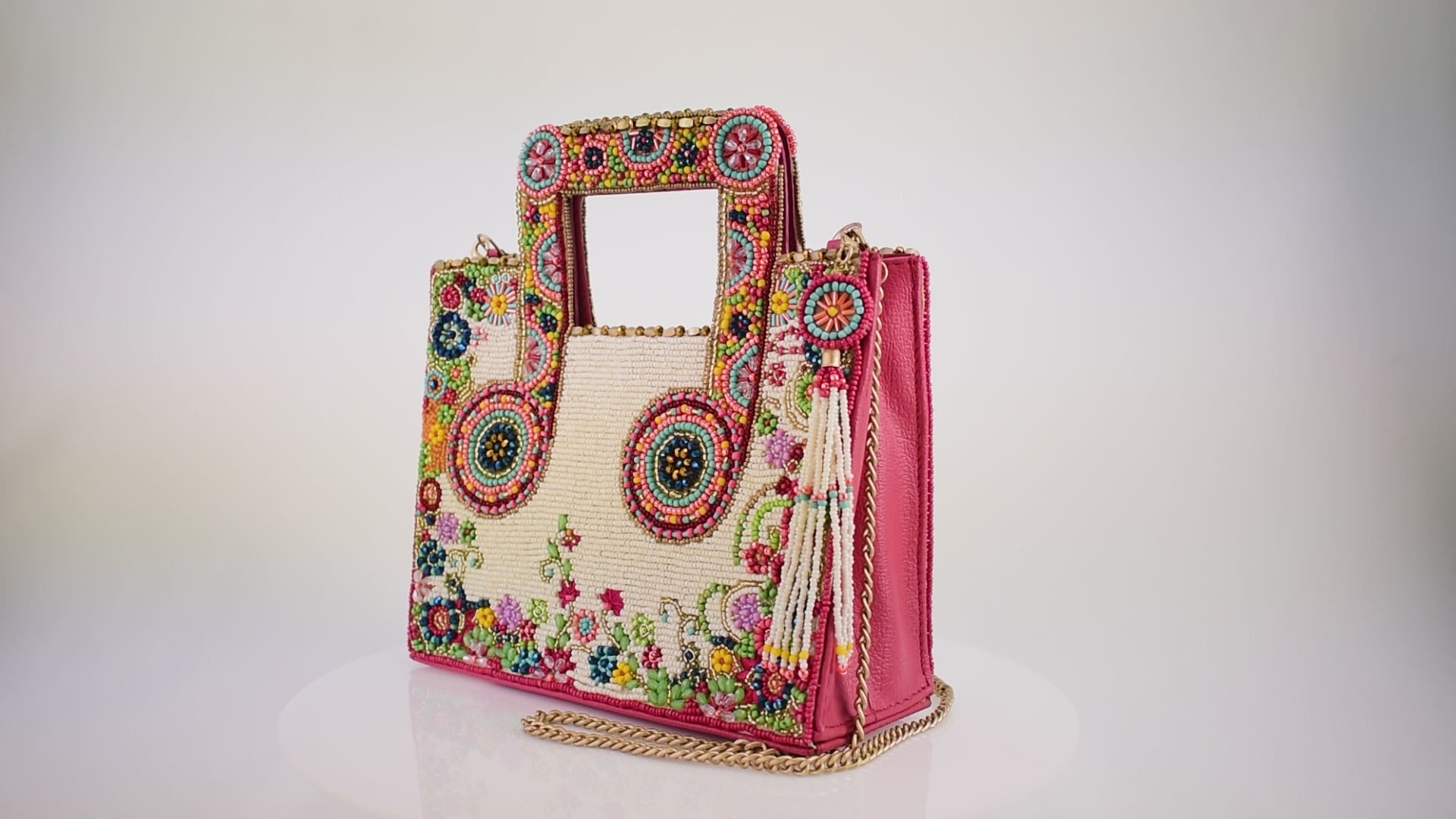 Turn up the fun with this festival-ready beaded musical bag. Bursting with bright colors and floral details, it feels like carrying your own little dance party wherever you go. Designed to be carried by hand or worn crossbody with the detachable chain strap, it’s joyful, artsy, and full of personality perfect for letting your style sing.