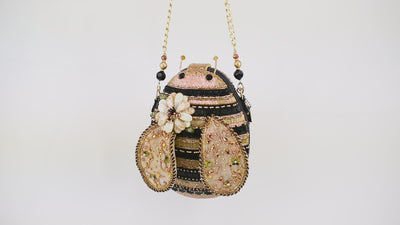 Buzz into style with this sparkling bee shaped bag, detailed with golden stripes, jeweled wings, and a sweet floral accent. Finished with a chain strap, it’s perfect to wear crossbody or carry as a statement clutch.